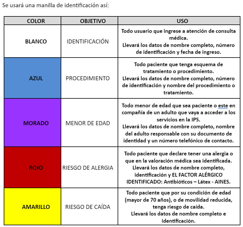 Como herramienta de seguridad del paciente se ha adoptado el uso de manillas o brazaletes de colores, para estandarizar una codificación de manejo integral en todas las áreas de atención en SAN RAFAEL CLÍNICA NATURISTA IPS SAS., sistema socializado y con guías en todas las áreas para su inmediato conocimiento por todo el personal de la IPS.